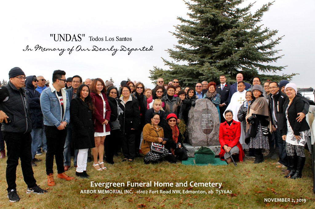 EDMONTON -Dubbed as “UNDAS 2019 Sa EVERGREEN” the Edmonton Filipino Community celebrated UNDAS (TODOS LOS SANTOS or ALL SAINTS/ALL-SOULS DAY) for the 4th year last November 2, 2019. More than 200 Edmonton Filipino Community members and friends attended at Edmonton’s Evergreen Cemetery and Funeral Home Centre and witnessed Filipino Priest Rev. Fr. JOSELITO “JOJO” CANTAL preside over the Liturgical and Memorial Services and the traditional Blessing of the FILIPINO GARDEN (HIMLAYANG FILIPINO), the MEMORIAL BOOK OF THE DEARLY DEPARTED and the “EXPRESSION OF THOUGHTS & LOVE for our Dearly Departed (a novel concept started in 2014).