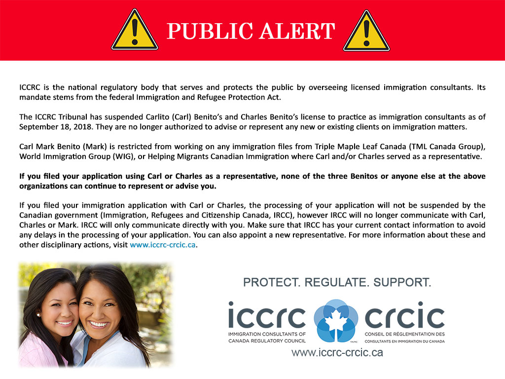 The ICCRC Tribunal has suspended Carlito (Carl) Benito’s and Charles Benito’s license to practice as immigration consultants as of September 18, 2018. They are no longer authorized to advise or represent any new or existing clients on immigration matters.